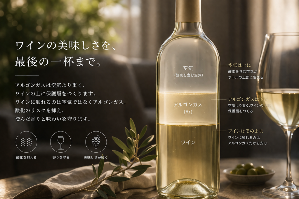 通常、ワインはボトルの中の酸素と結合して酸化してしまいますが、アルゴンがボトルの中にあれば、ワインは酸素と結合することはなく、酸化を防ぐことができます。
